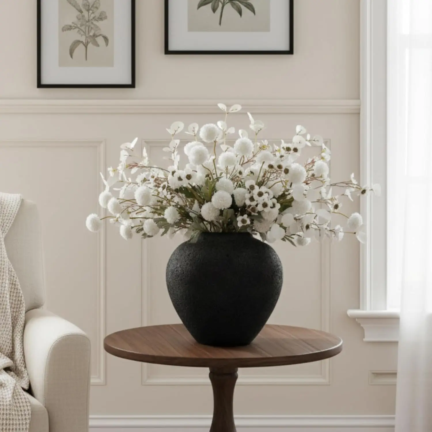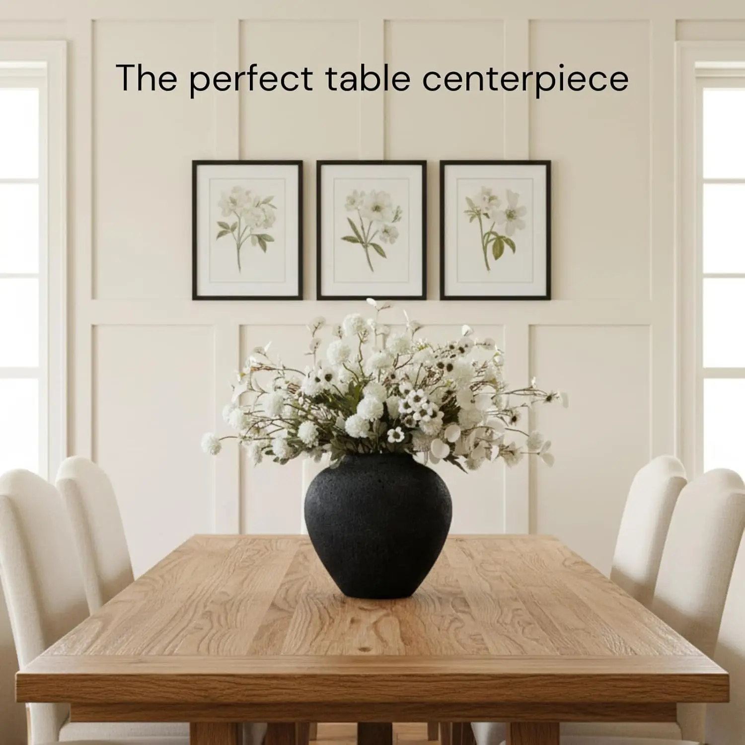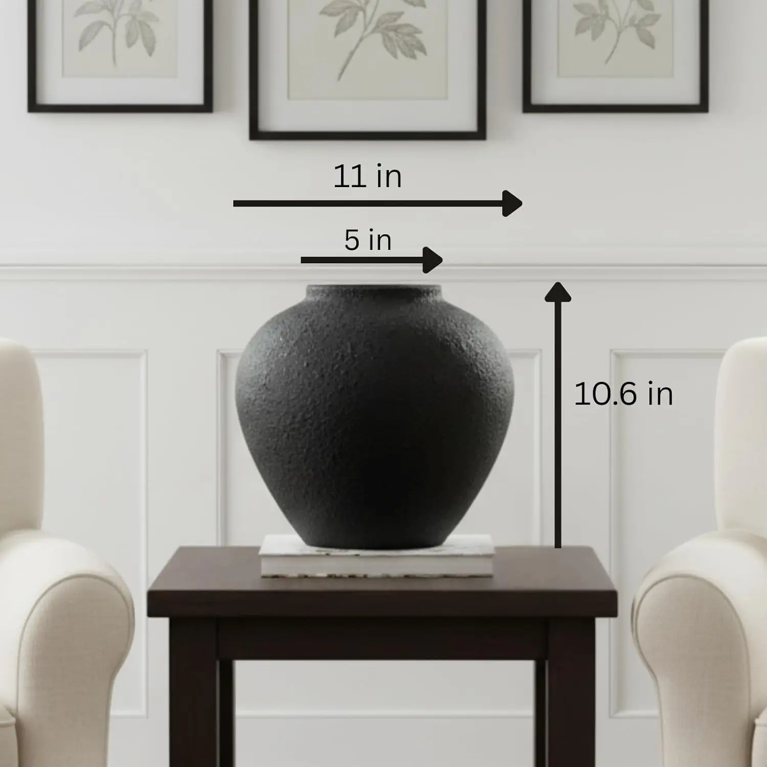 Elevate your home decor with this stunning large black round vase that combines rustic charm with modern farmhouse aesthetics. Perfect for creating beautiful centerpieces and adding a touch of earthy elegance to any space. Key Features: - **Elegant Design**: This large round vase features a pottery-inspired look with an earthy textured distressed finish, creating a unique wabi-sabi appeal that adds character to any room. - **Versatile Decor Piece**: Ideal as a dining room table centerpiece, console table decor, or entryway accent. Seamlessly fits into modern farmhouse, rustic, vintage retro, minimalist shabby chic, and neutral fall home decor styles. - **Perfect for Floral Arrangements**: With its wide mouth and generous dimensions (height 10.6 inches, width 11 inches), this vase accommodates long stem artificial flowers, greenery, or fresh floral arrangements beautifully. - **High-Quality Craftsmanship**: Crafted to mimic the appearance of stoneware and ceramic vases with a rustic iron finish. The distressed surface adds depth and visual interest while maintaining durability. - **Multi-Room Application**: Enhances living room decor, kitchen table settings, dresser tops, mantel displays, or any space needing an elegant decorative accent. Its neutral black color complements various color schemes. - **Spanish Market Appeal**: "Jarrones grandes para sala elegantes con estilo rústico" - This decorative large vase for living rooms combines rustic style with elegance, perfect as flower vases for centerpieces in dining rooms or living areas. This versatile extra large round vase serves as both functional floral container and standalone decorative object. Its timeless design transitions effortlessly between seasons and decor trends while adding quiet luxury to your home environment.